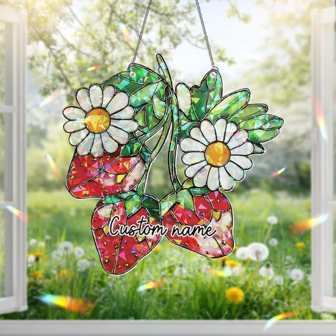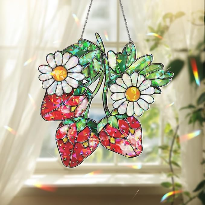 Strawberry Suncatcher – Daisy Flower Window Hanging, Fruit Sun Catchers Indoor Window Ornament for Kitchen and Garden Décor, Plant Gifts for Women, Grandma, Mother's Day, Christmas