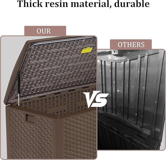 • All-Weather Durability Made from heavy-duty resin, this waterproof, UV-resistant, and corrosion-resistant deck box with stands rain, sun, and snow. It protects waterproof cushions, pool floats, and storage bins year-round, maintaining its look in any garden, patio, or pool deck setting.