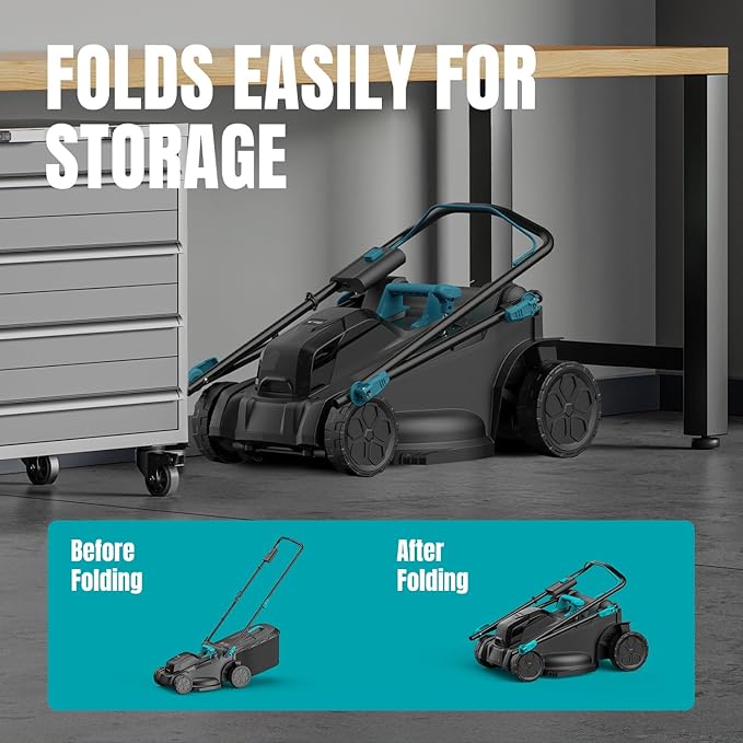 • EASY TO USE AND STORAGE:This walk-behind lawn mower weighs only 26.5 lbs, making it very light and convenient to pull and push, which eases your gardening and keeps you fatigue-free. The handle is foldable for compact storage and easy carrying.