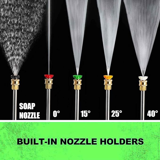 • Versatile Nozzles for Every Job, Every Surface! Choose the perfect spray angle with our specialized nozzles – designed for all surfaces! The 0° tip powers through the toughest messes, 15° for concrete, 25° for wood and siding, 40° for delicate surfaces, and a black tip to get rich, soapy bubbles for car washing. Switch up and clean with precision!