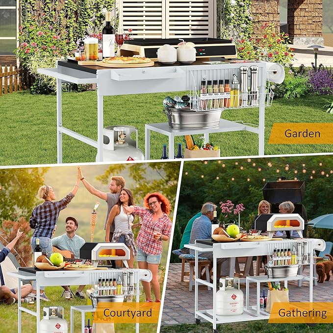• Suitable for Most Countertop Grills and Grills: This outdoor kitchen table fits 12/16-inch pizza ovens, Blackstone 17"/22", Ninja oo101/OG701, Cuisinart CGG-403, Gozney Roccbox, and Solo Stove pizza ovens .Its spacious top easily accommodates pizza ovens, portable grills, air fryers, griddles and other tabletop grills.