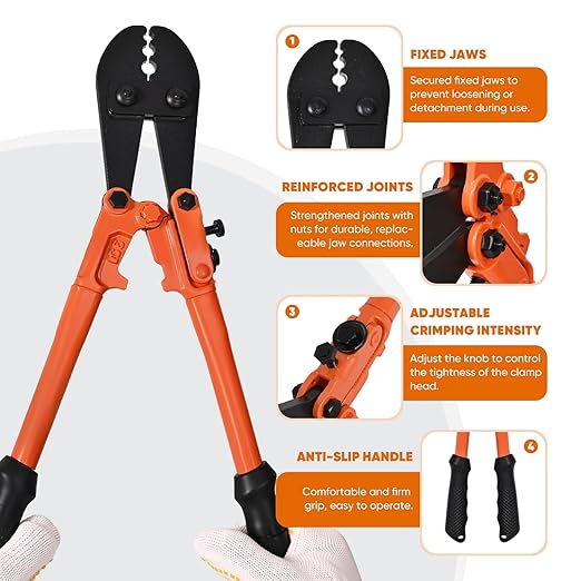 • Heavy-duty Swaging Tool: crafted from premium steel and high-quality metals to withstand rigorous use. The extended handle provides superior leverage, allowing you to crimp cables effortlessly for a secure, professional finish. Its ergonomic non-slip grip offers maximum comfort and control, reducing hand strain even during prolonged jobs. Versatile and reliable, it features three precision crimping positions (1/16", 3/32", and 1/8") to handle aluminum oval sleeves, double sleeves, and annealed copper sleeves with ease. For best results: ✓ Crimp once - don't squeeze multiple times. ✓ Always use the right size sleeves.