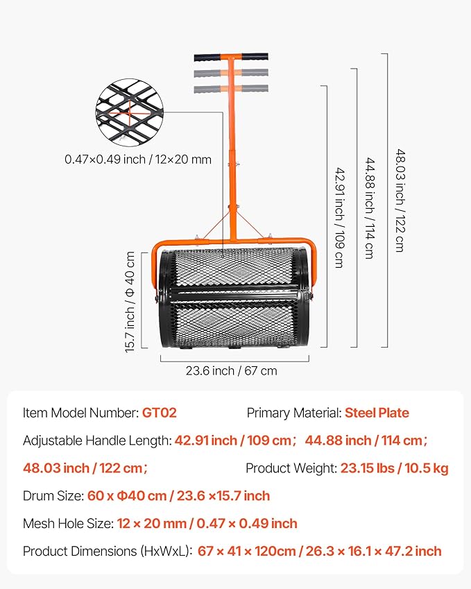 • Durable and Sturdy: Built with an integrated steel drum and precision-cutting technology, this compost spreader is solid and sleek. The 25 mm (0.98 inch) thick handle is powder-coated for enhanced durability and rust resistance. Its large size (60 x Φ40 cm) ensures higher spreading efficiency for lawns and farmlands.