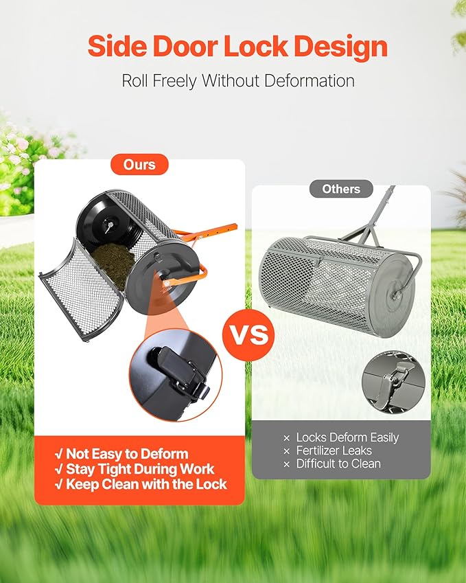 • Large Capacity Drum: The 24-inch peat moss roller holds up to 2.66 cubic feet of material, reducing the need for frequent refills. Load it once with grass seed, compost, or soil conditioner to cover large areas quickly and easily.
