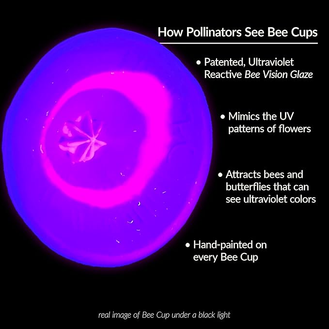 • UV-Reactive Glaze Attracts Pollinators: Bees and many other pollinators are naturally drawn to ultraviolet light. Every Bee Cup's center is hand-painted with our patented Ultraviolet Bee Vision Glaze, designed to mimic the UV glow and patterns of flowers, making them highly visible to pollinators, attracting more into your garden.