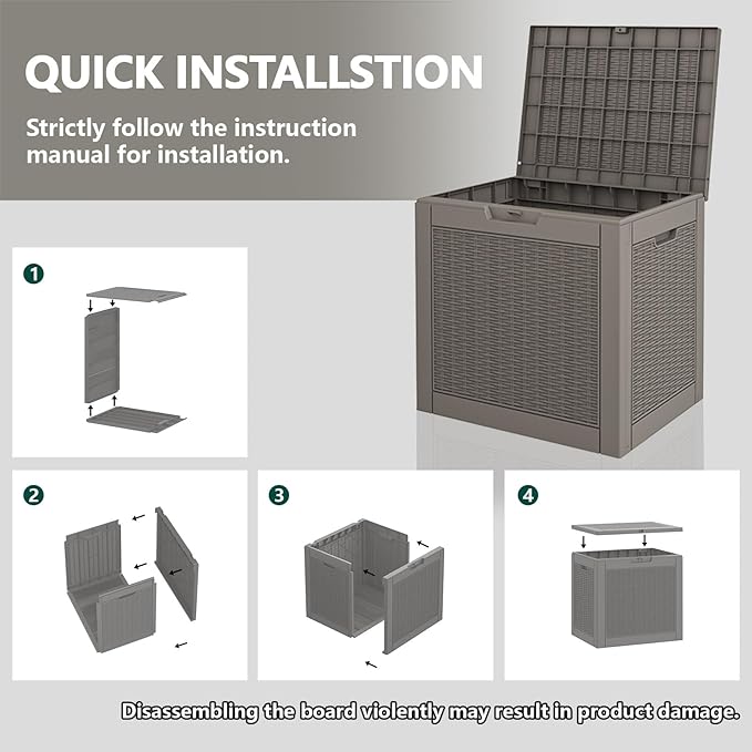 • 🔧【TOOL-FREE ASSEMBLY IN MINUTES】 No extra tools, no hassle — this outdoor storage box features a snap-fit design that lets you assemble it in about 10 minutes. Perfect for quick setup so you can enjoy more time organizing and less time working.