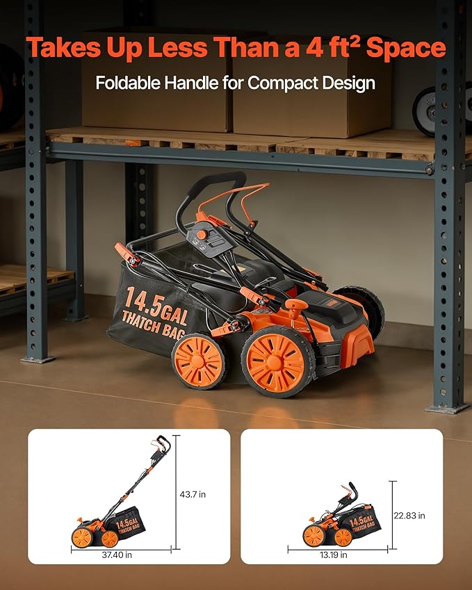 • Easy Setup & Compact Storage: This corded dethatcher and scarifier boasts a quick 2-step start-up with no complicated assembly. Its foldable handle reduces overall height for compact storage, and the lightweight 26.68 lbs body makes transport easy