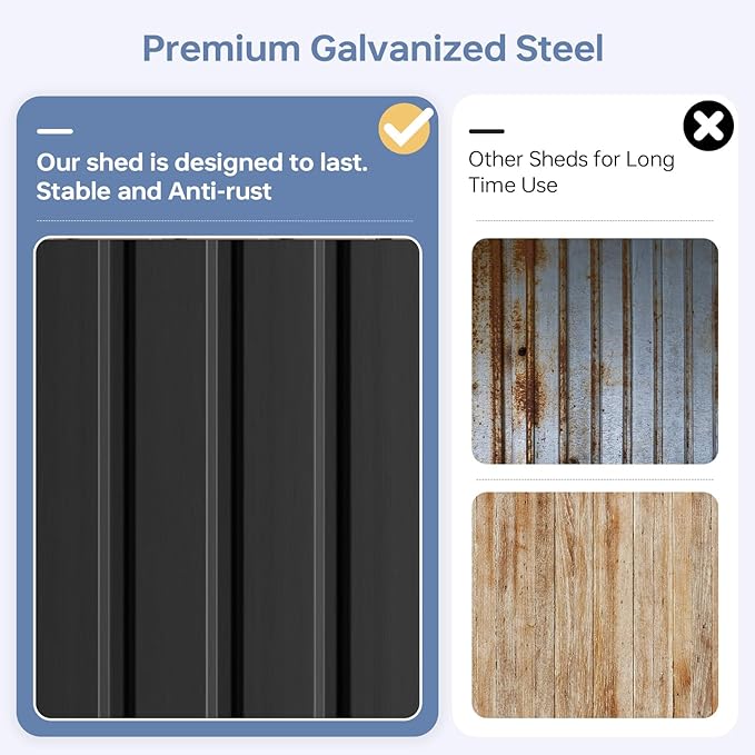 • Robust & Weatherproof Build: This outdoor storage shed is constructed from galvanized steel with waterproof engineering. It delivers enduring resilience against severe weather. Its reinforced metal roof and walls prevent deformation, while the sturdy frame withstands winds up to 30mph (Level 6) and snow loads of 6 inches.