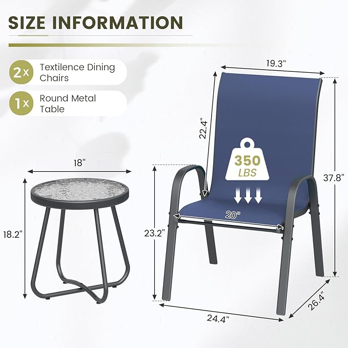 UDPATIO Patio Dining Set of 3, Outdoor Table and Chairs Set with Glass Table, 2 Stackable Patio Chairs with High Back, Outdoor Furniture Sets for Deck Garden Backyard Lawn Poolside (Blue)