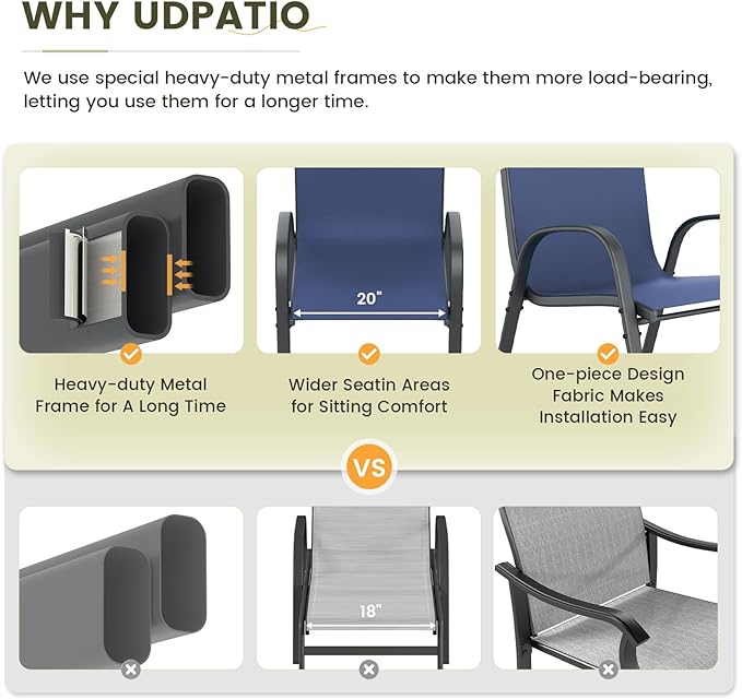 • 【WIDER SEAT & HIGH BACK】Our patio dining chairs are 20 inches wider than traditional 18-inch seating. It also features an ergonomic high back structure. The comfortable width of the chair seat and the contoured backrest make your leisure time more comfortable