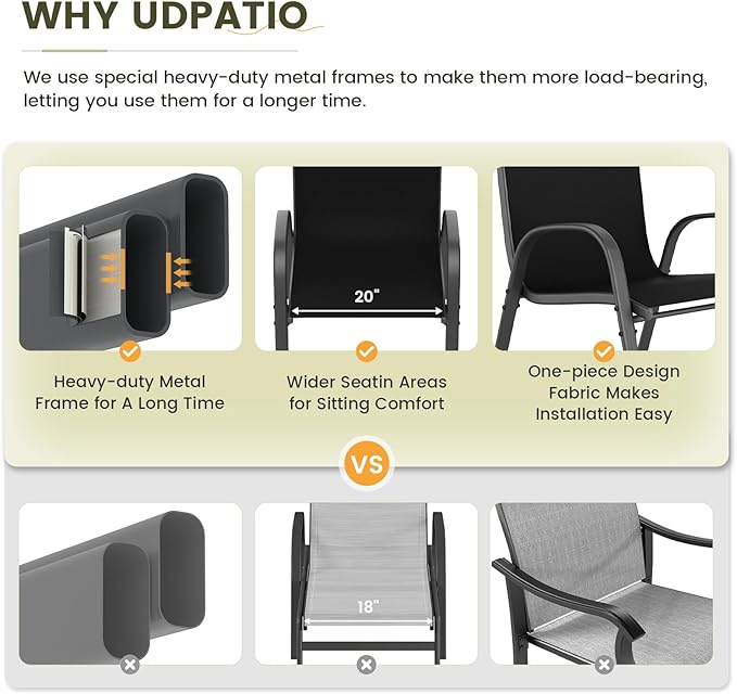 • 【WIDER SEAT & HIGH BACK】Our patio dining chairs are 20 inches wider than traditional 18-inch seating. It also features an ergonomic high back structure. The comfortable width of the chair seat and the contoured backrest make your leisure time more comfortable