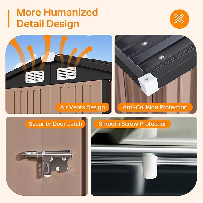 • Robust & Weatherproof Build: This outdoor storage shed is constructed from galvanized steel with waterproof engineering. It delivers enduring resilience against severe weather. Its reinforced metal roof and walls prevent deformation, while the sturdy frame withstands winds up to 30mph (Level 6) and snow loads of 6 inches.