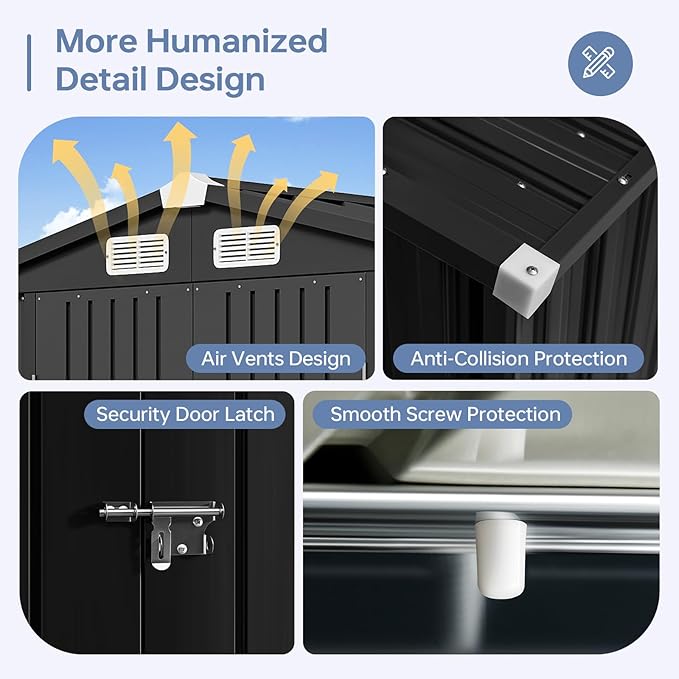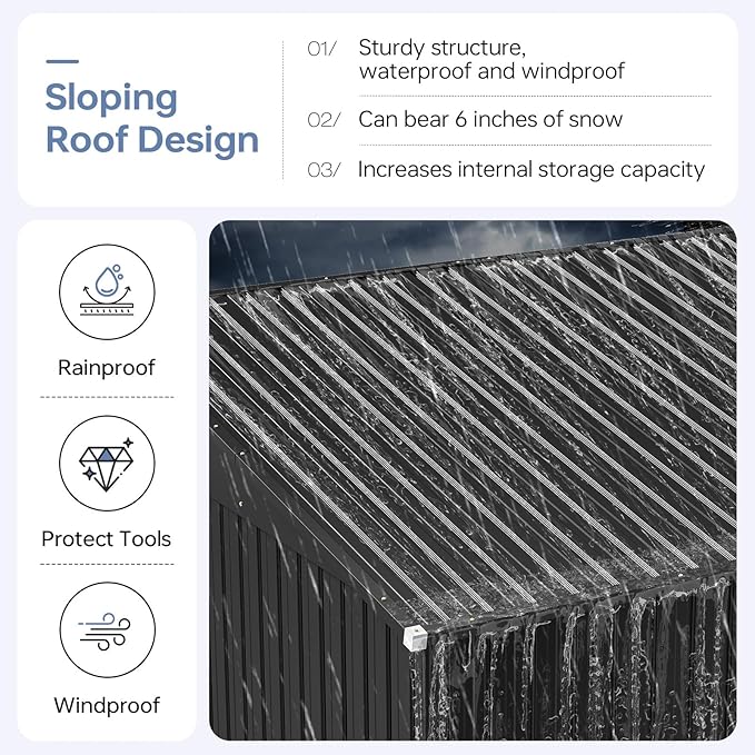 • Robust & Weatherproof Build: This outdoor storage shed is constructed from galvanized steel with waterproof engineering. It delivers enduring resilience against severe weather. Its reinforced metal roof and walls prevent deformation, while the sturdy frame withstands winds up to 30mph (Level 6) and snow loads of 6 inches.