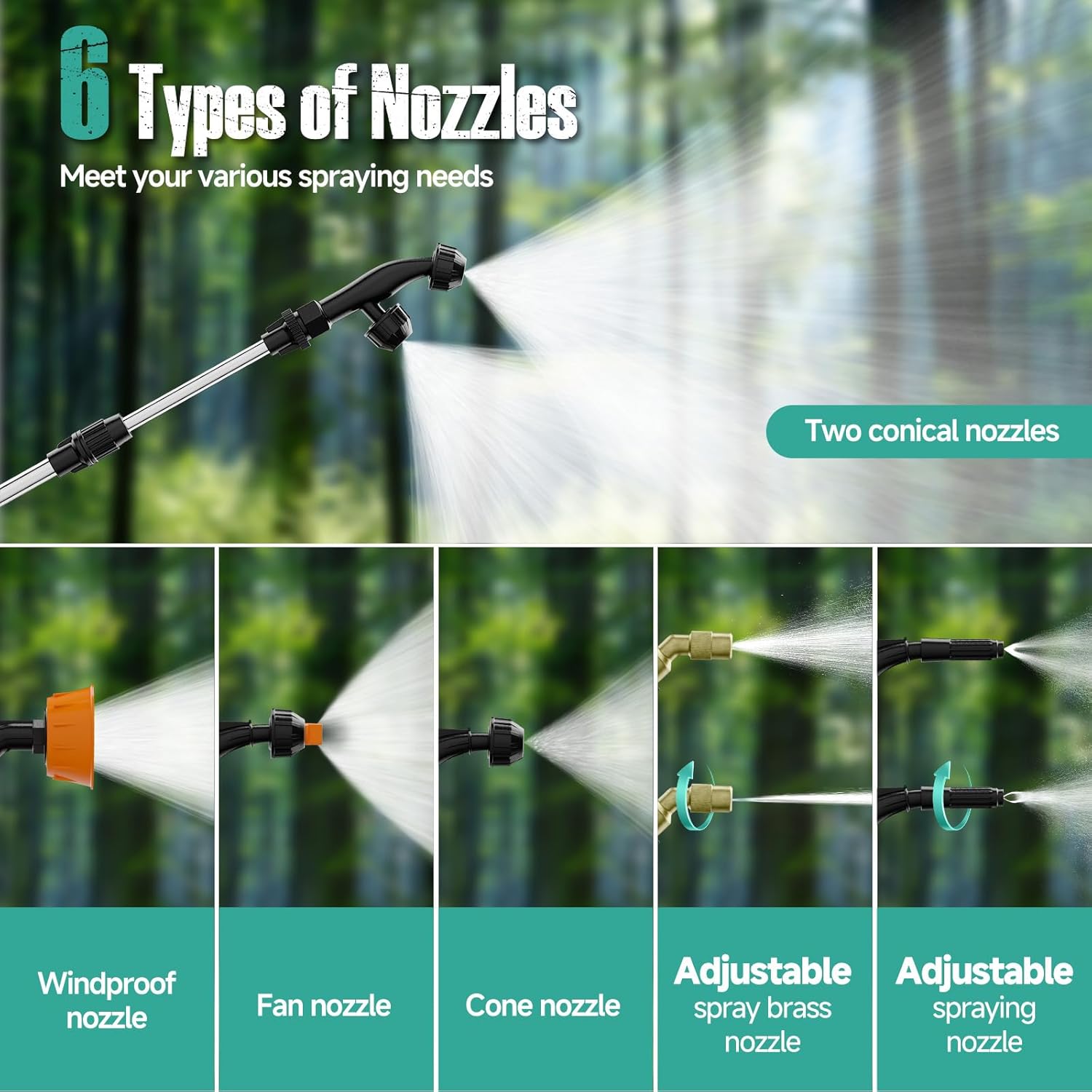 • 【6 Nozzles with Adjustable Spray Patterns】KIMO battery backpack sprayer comes with 6 nozzles, including 2 adjustable nozzles that let you customize the spray from a fine mist to a coarse stream. This versatility makes it perfect for a wide range of tasks—whether you're tending to delicate plants or tackling hardy vegetation. The adjustable nozzles can be easily switched with one hand, allowing you to adapt quickly without interrupting your workflow