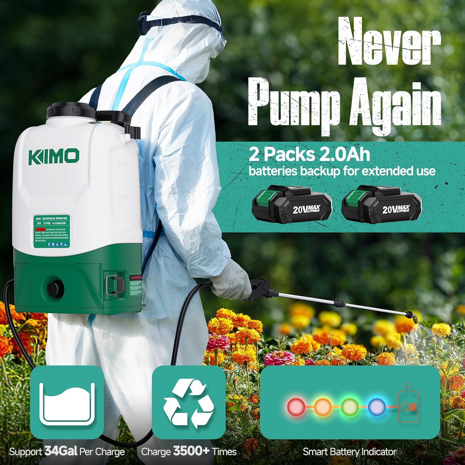 KIMO 4.3 Gallon Battery Powered Backpack Sprayer, 2PCS 20V 2.0Ah Battery & Fast Charger, 31" Telescopic Wand, 6 Nozzles, No Pump Needed, 0-73 PSI Electric Garden Sprayer for Weed, Lawn, Yard, Cleaning