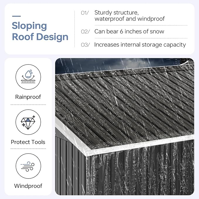 • Robust & Weatherproof Build: This outdoor storage shed is constructed from galvanized steel with waterproof engineering. It delivers enduring resilience against severe weather. Its reinforced metal roof and walls prevent deformation, while the sturdy frame withstands winds up to 30mph (Level 6) and snow loads of 6 inches.