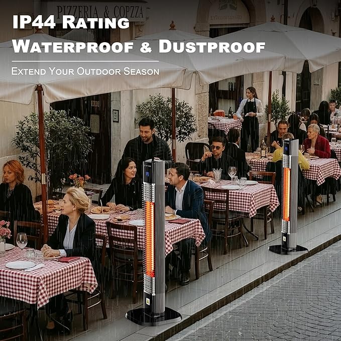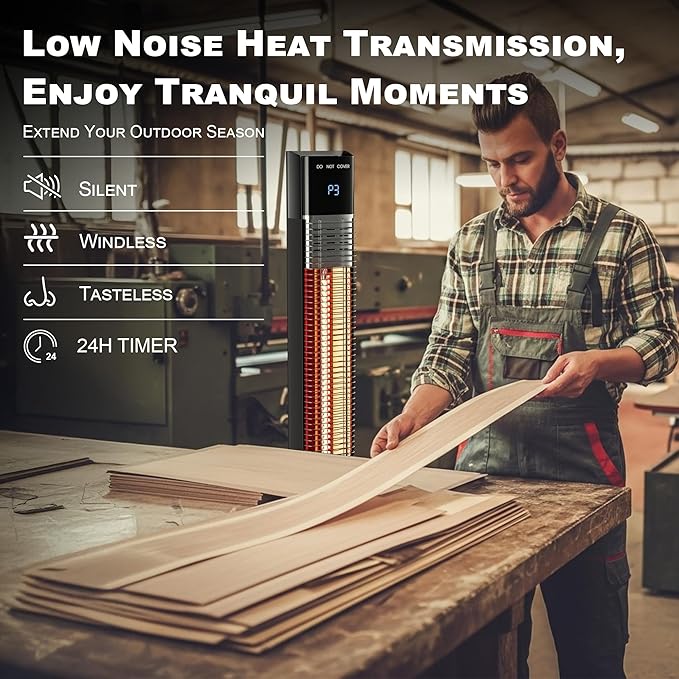 • 24H TIMER: To avoid potential safety hazards and save energy, you can set a time from 1-24 hours with the outdoor electric heater. The infrared heater is great for noise-sensitive environments because it doesn't use a fan- it just heats light
