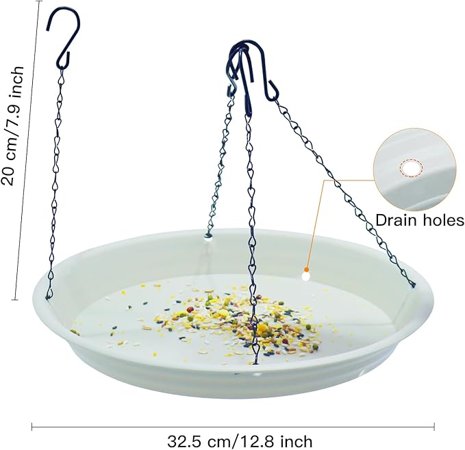 • The Hanging Bird Feeder for attracts birds: The tray has a 12" feeding area that can accommodate Birds of different sizes. Our design is based on the data from actual usage feedback and is very sturdy even under extreme weather conditions. The feeding tray is connected to a stainless steel chain. You don't have to worry about any risk of this tray bird feeder falling