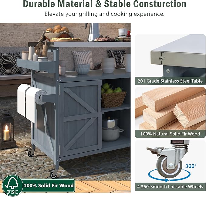 • Heavy Duty Structure: Crafted from 100% exquisite fir wood and featuring a 1.2-inch thick 201 stainless steel tabletop, this outdoor grill cart is both durable and easy to clean. Its natural charm and minimal chemical coatings ensure a skin-friendly and long-lasting product, perfect for any outdoor setting.